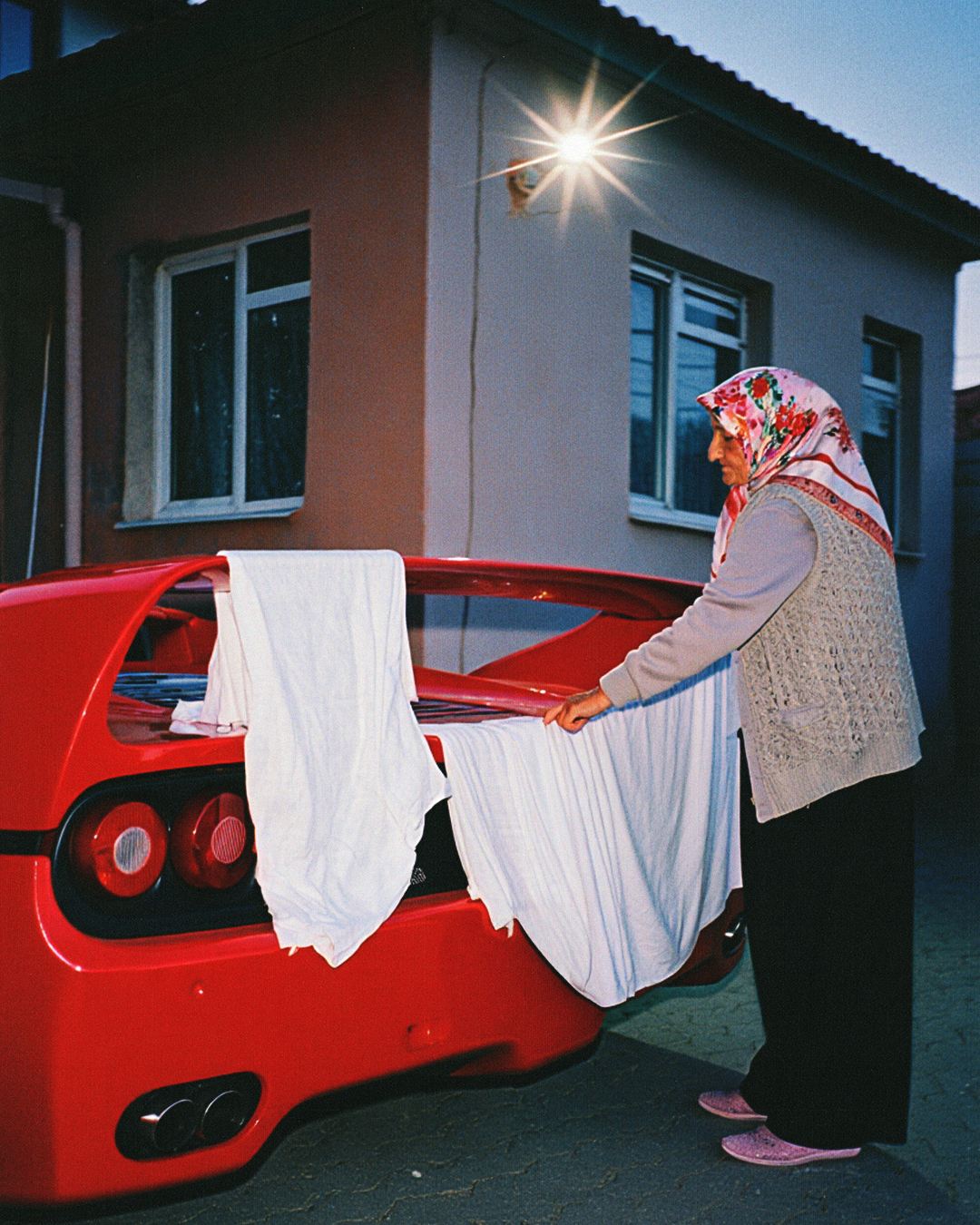 The image that spread was an elderly Turkish woman in a folding chair in front of a pink Subaru Impreza, the bodywork printed with hot-rod flames, the scene lit like a courtyard in Anatolia at three in the afternoon. Her headscarf tied in the old way. The car behind her entirely irrelevant to her state of mind. Within days, it was moving across the world, amplified by Arabic accounts that reach millions, reshared by people who couldn’t fully explain the pull. “If someone gets confused about my work,” CES says, “then I’ve done my job.”