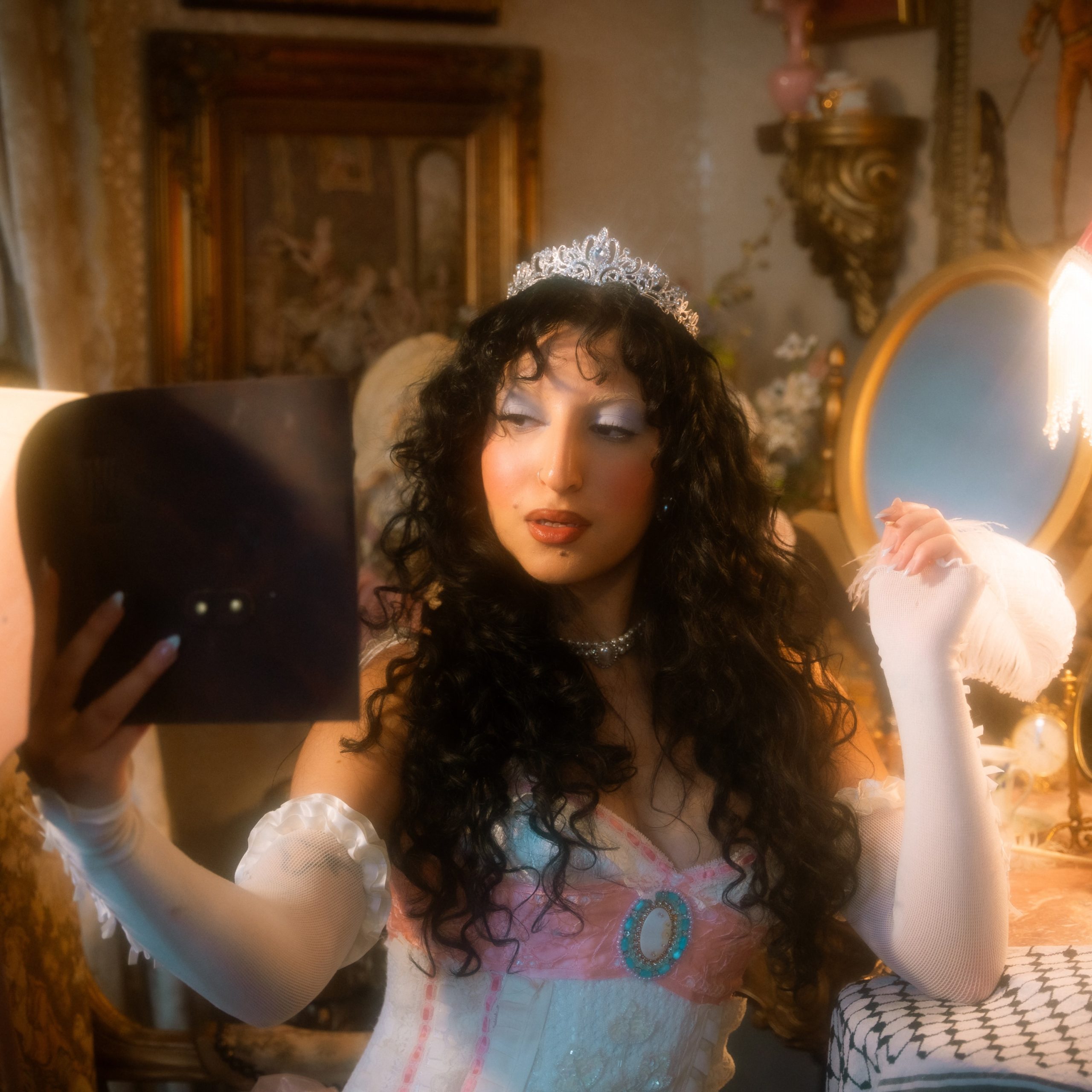 The music video extends that presence further. Amira appears in ornate, empire-era dress, lace and pearls framing a steady, unsentimental gaze. She plays with decadence without yielding to it. In a world where empire has left real scars, the choice to inhabit its costume without deference carries weight. She is not reenacting power. She is handling it.
