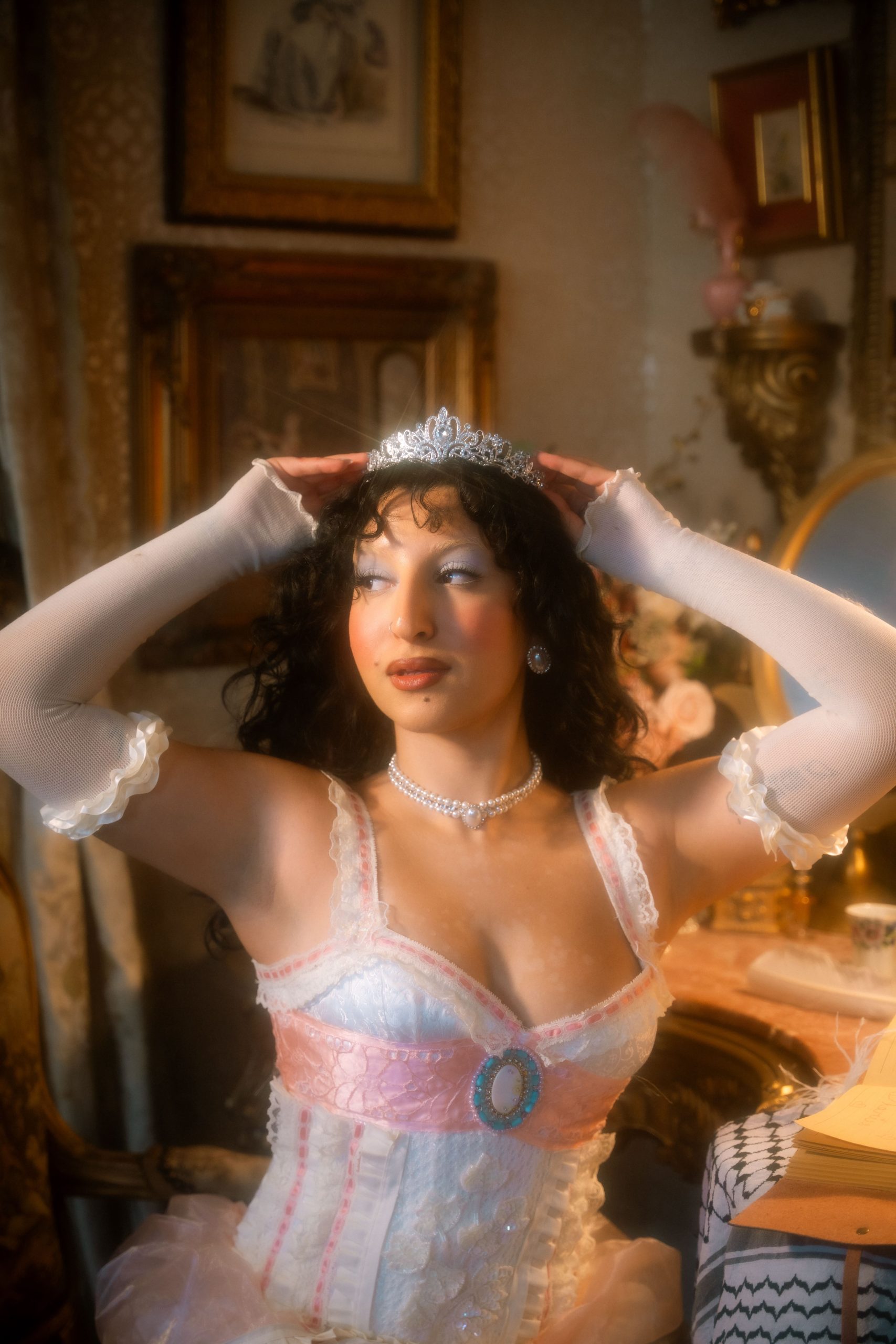 She mixes eras and textures freely. The looks shift but never feel accidental, corsetry to lace, leather to metal, always anchored by her tight Arab curls: a material Arab girl in a material Western world. The contradiction is there, but she doesn’t stop to resolve it.
